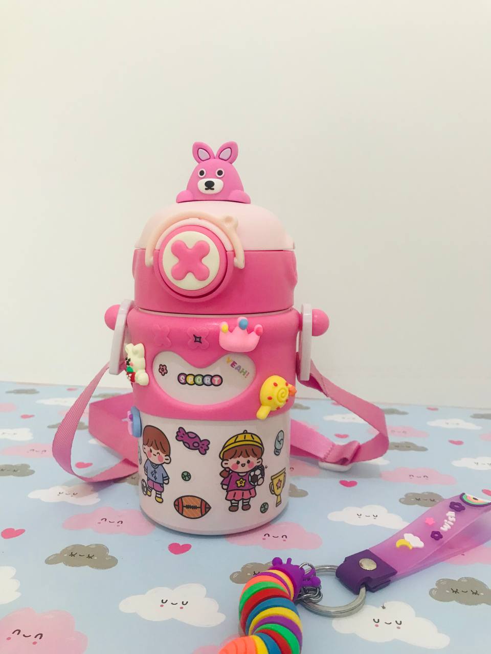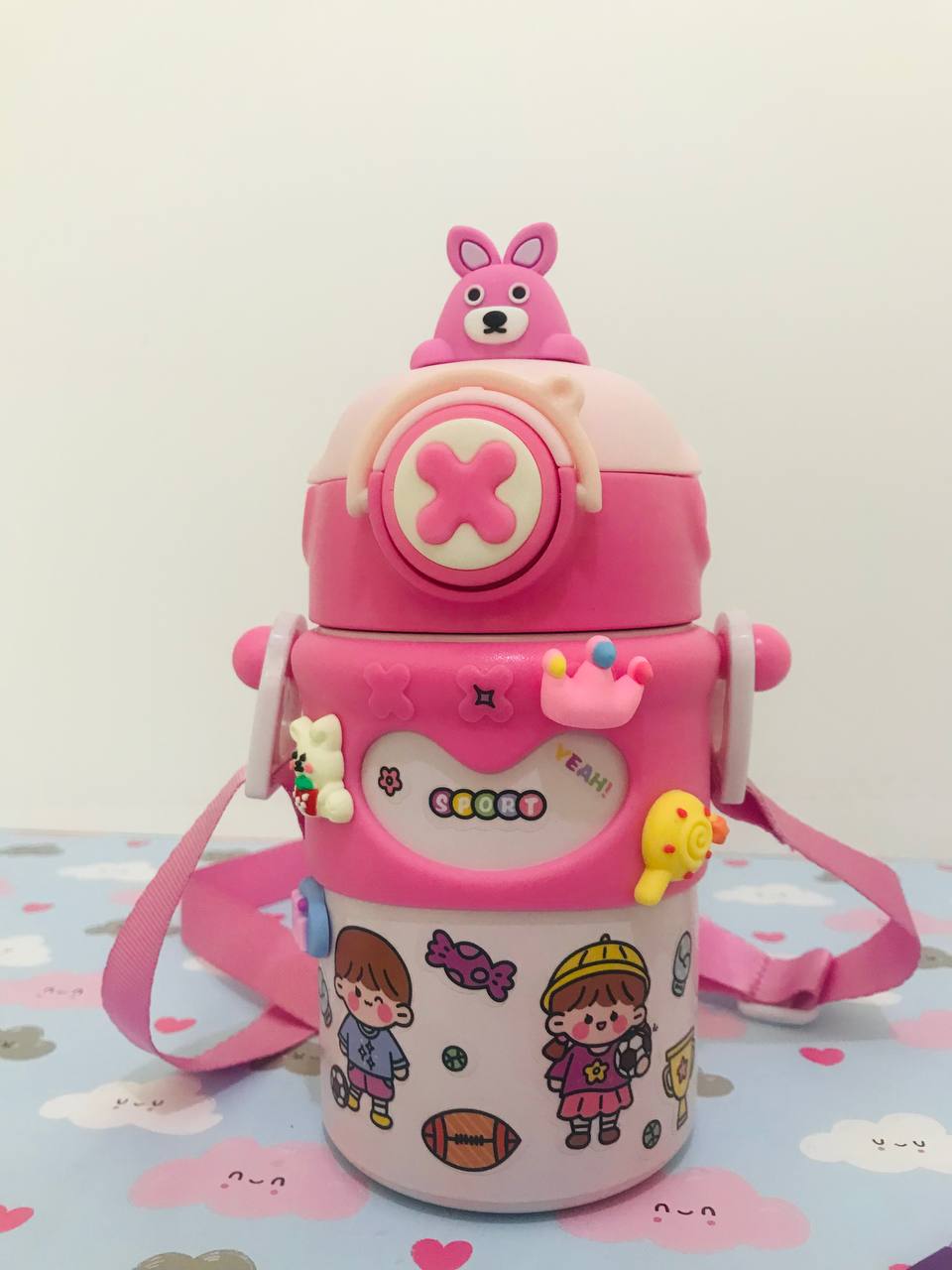 قمقمه فلاسکی کودک نی دار می باشد دارای بند دوشی است دوجداره می باشد استیکر دار و عروسکی درب دکمه ای و قفل دار