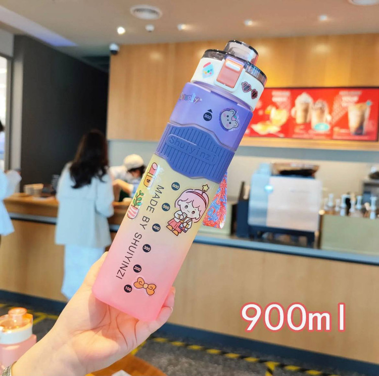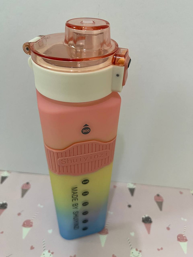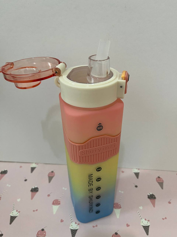 قمقمه مکعبی 900میل هفت رنگ بسیار باکیفیت بالا دارای بند پارچه ای می باشد دور سیلیکونی استیکر دار و دوحالته نی دار و ساده می باشد مناسب هر سنی