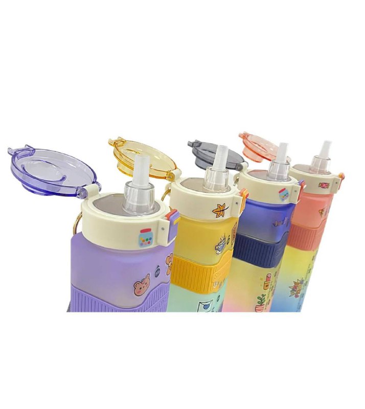 قمقمه مکعبی 900میل هفت رنگ بسیار باکیفیت بالا دارای بند پارچه ای می باشد دور سیلیکونی استیکر دار و دوحالته نی دار و ساده می باشد مناسب هر سنی